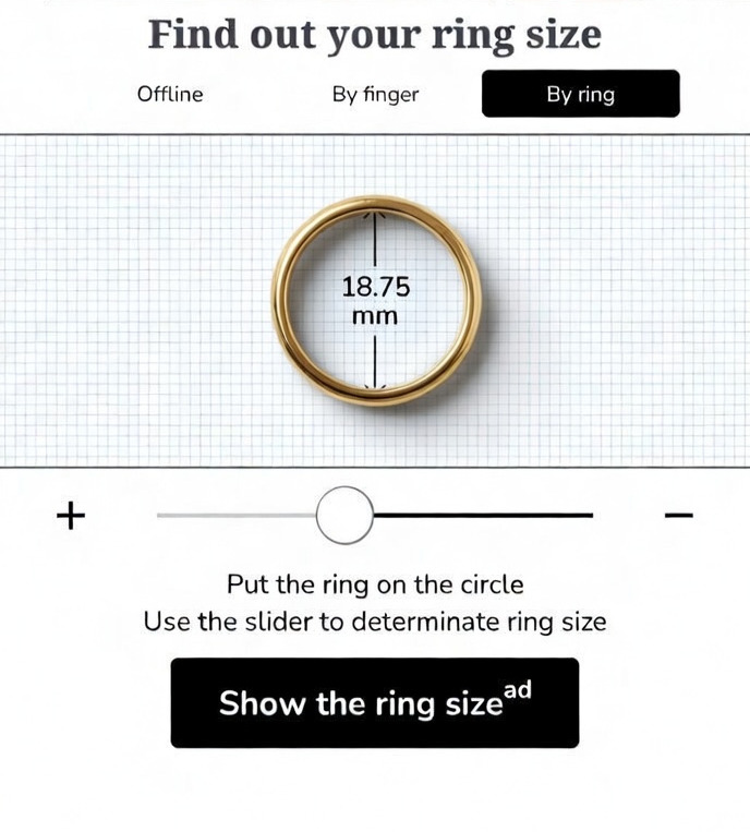 אפשרות שנייה – אפליקציית RING SIZER, מניחים טבעת קיימת על גבי מסך הטלפון (עדיף שהטבעת תהיה כמה שיותר פשוטה ודקה) ומזיזים את הסמן כדי שהעיגול באפליקציה יתאים בדיוק להיקף הפנימי של הטבעת, את התוצאה תשווי לטבלת המידות. יש לשים לב שהמדידה נעשית מהקוטר הפנימי של הטבעת ולא החיצוני.