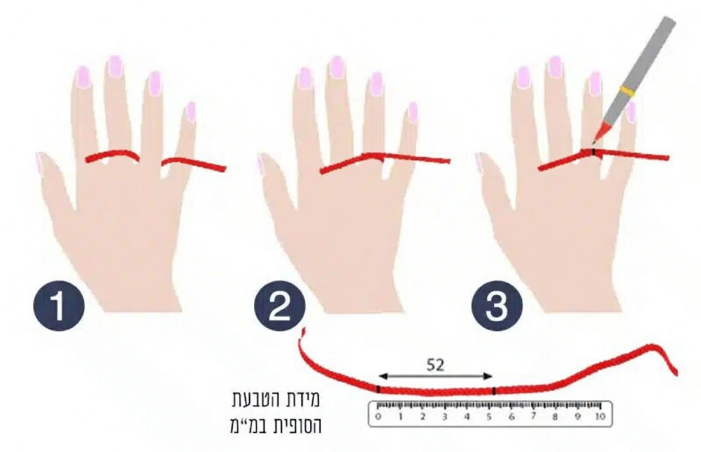 אפשרות שלישית – לגשת לצורף מקומי ולמדוד את האצבע בעזרת מדיד מקצועי. אופציה זו היא המדויקת ביותר.