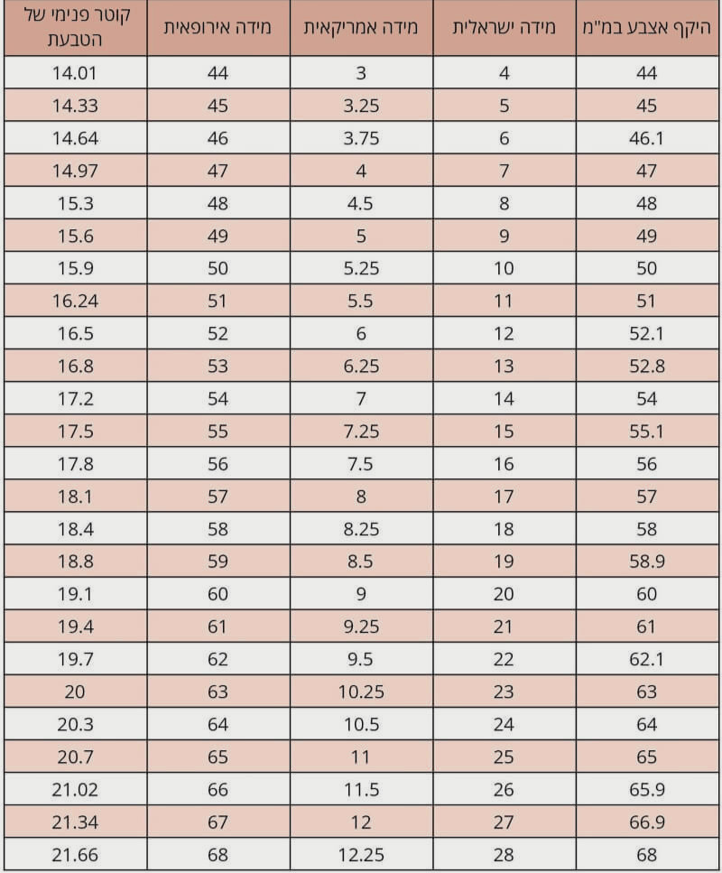 כדי להקל עלייך, ריכזנו את הנתונים המקובלים בישראל. שימי לב שבחלק מהדגמים, במיוחד בטבעות עבות מומלץ לקחת חצי מידה או מידה אחת יותר מהרגיל.