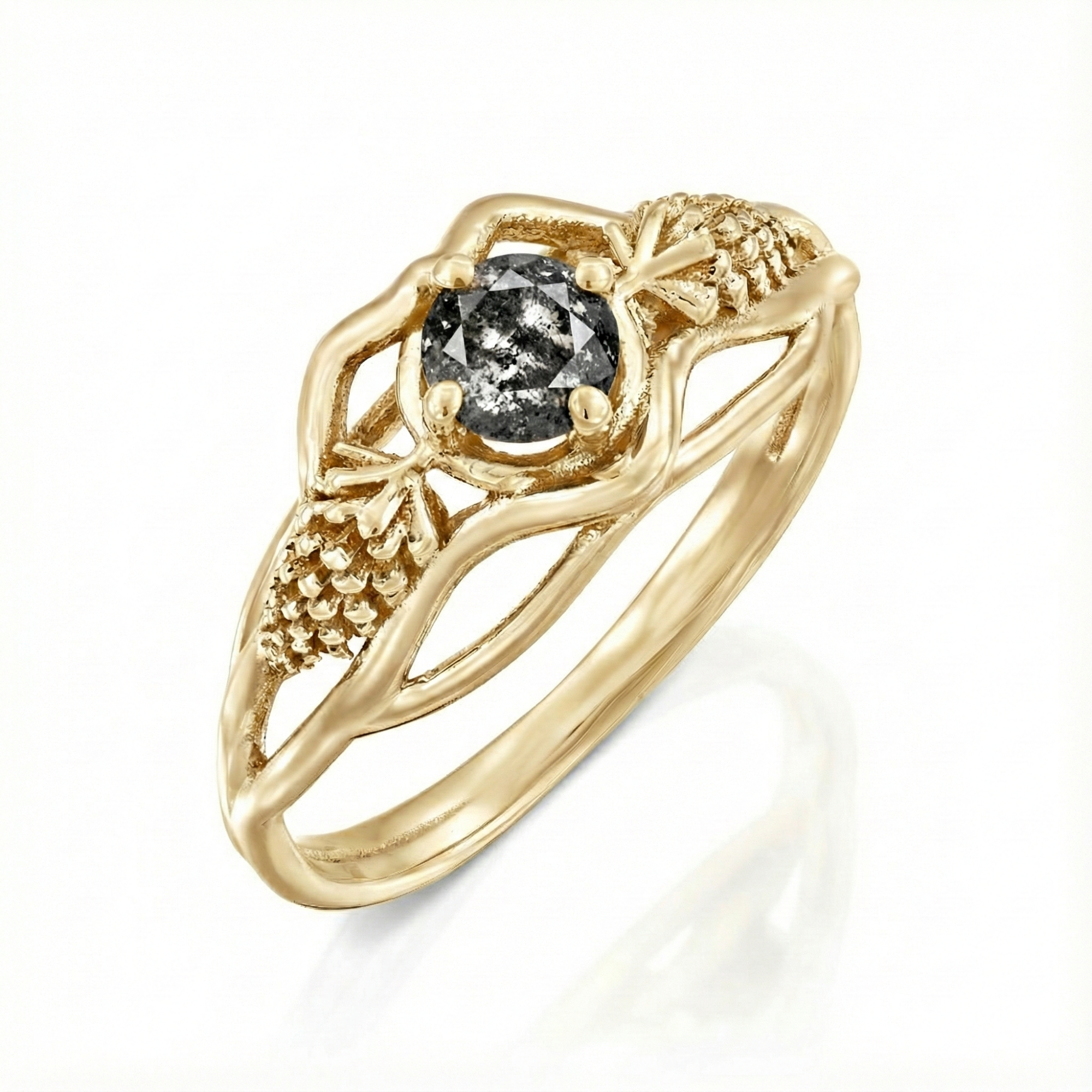 טבעת זהב מעוצבת מוטיב ענפים עם שני אצטרובלים בצדדים ובמרכז יהלום טבעי Salt & Pepper